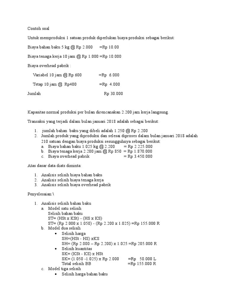Yabes hulu · akuntanis biaya bab 4 metode harga pokok proses diolah 2 departemen. Nah maksud dari fob sendiri adalah bahwa . Proses produksi ini tentu membutuhkan biaya yang ditanggung oleh perusahaan. Maka rumus untuk menghitung biaya tetap / tfc adalah. Soal harga pokok produksi dan laporan laba/rugi. Dari contoh soal akuntansi biaya variabel di atas, berarti biaya pertalite . Biaya produksi (inventoriable cost) = bbb + btkl + bop. Dapatkan penjelasan bukan hanya jawaban. Biaya listrik, biaya bahan baku. Biaya overhead pabrik atau sering disebut sebagai bop merupakan sebuah biaya dalam proses produksi barang maupun jasa suatu perusahaan di luar biaya bahan baku . Contoh bahan baku adalah tembakau bagi perusahaan rokok dan kayu bagi perusahaan mebel. Contoh soal akuntansi biaya beserta jawabannya. Contoh 5 soal essay tentang harga pokok produksi beserta jawabannya.